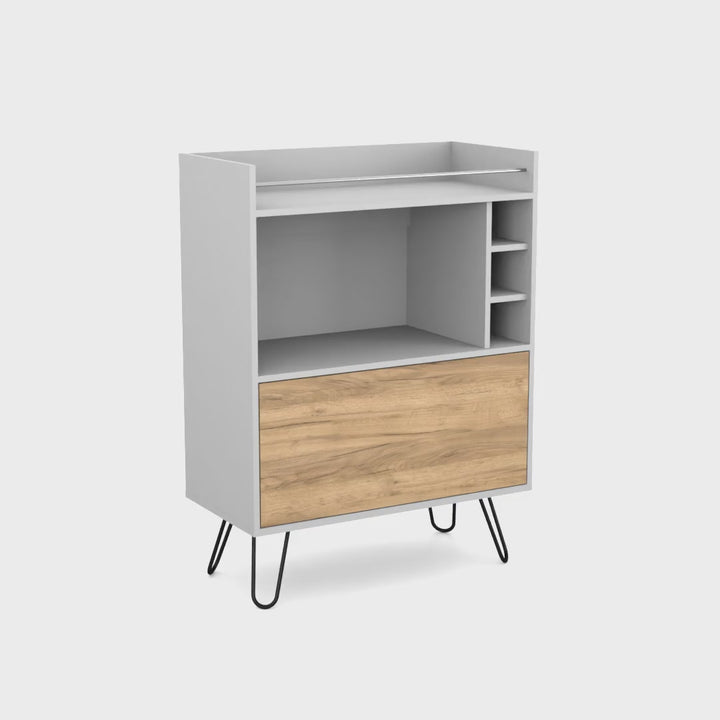 Elevate your living room with the Platea Bar Cabinet, a stylish and functional centerpiece designed to enhance any gathering space. Crafted from durable manufactured wood in a white and macadamia finish, this cabinet blends modern design with practicality. Featuring a spacious open shelf for displaying glassware, a concealed cabinet with a drop-down door for discreet storage, and dedicated wine racks to organize up to four bottles. Its sturdy hairpin legs add a trendy industrial touch, ensuring stability while making it a standout addition to your decor. Compact yet capacious, this bar cabinet is perfect for small spaces or as an accent piece in larger rooms.