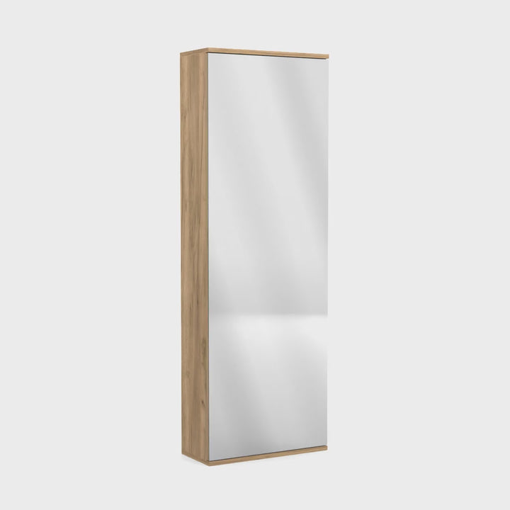 The Chimg Wall Mounted Shoe Rack Mirror is a special design that brings style and functionality to your place and keeps your shoes organized way. Wall-mounted mirrored door, storage capacity for 10 pairs of shoes, perfect space saver extra storage solution for any room, designed with Macadamia manufactured wood.